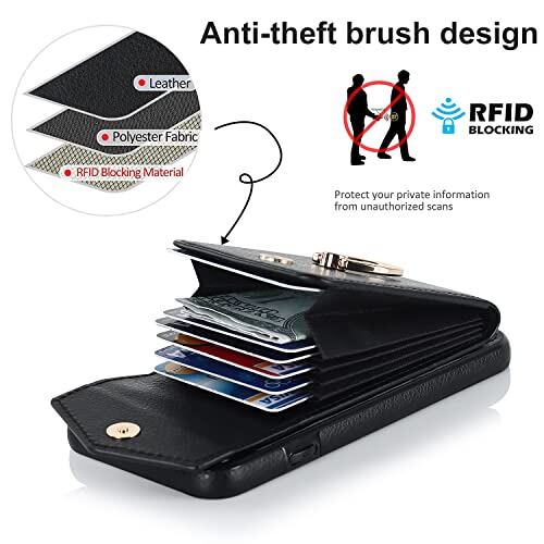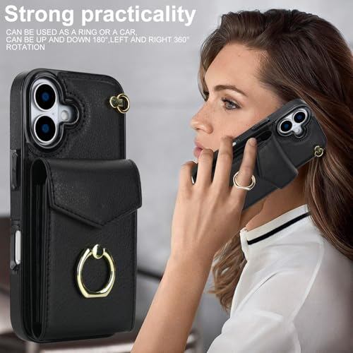 GOKIGIOD 適用 iPhone 17 ケース リング付き 背面 財布型 カード入れ いphone17 リング カバー ストラップ アイフォン 17 スマホケース 背面ポケット カード収納 可愛い お洒落 RFIDスキミング防止機能 カードポケット ハンドストラップ 縄掛け 携帯カバー ブラック Black