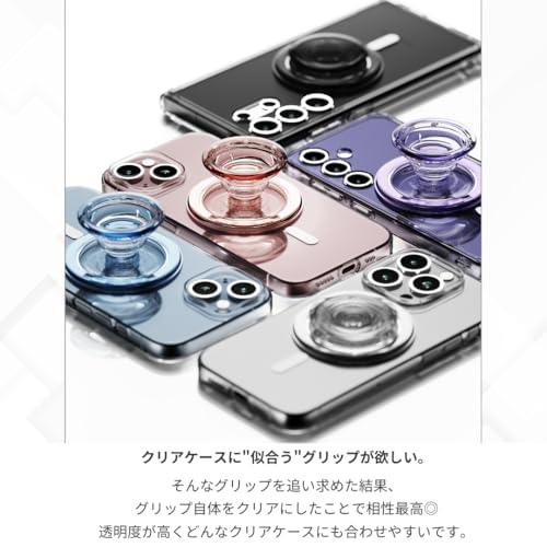 【ポップでおしゃれな、魅せるグリップ革命】 美しさと機能性を兼ね備えたMagSafe対応の次世代スマホグリップ。 どんなスマートフォンにも合わせやすいのが魅力です。 クリア、クリアブラック、クリアブルー、クリアピンク、クリアパープルの5色展開。お好みに合わせて選べます。