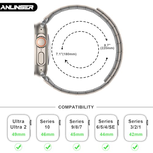 【対応機種】Anlinser シリコンマグネットスマートウォッチバンドは、Apple Watch Ultra 3/2/1 49mm、Apple Watch Series 11、Series 10 46mm、Apple Watch Series 9、Series 8、Series 7、Series 6、Series 5、Series 4、Series 3、Series 2、Series 1 SE 2022/SE 2020 45mm、44mm、42mmと互換性があり、7.1インチから8.7インチ(180mm-220mm)の手首に適しています。