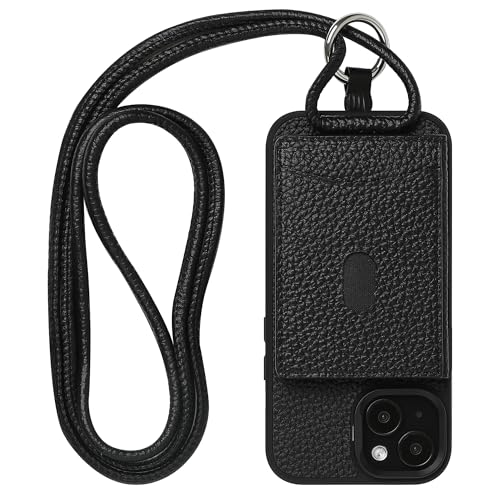 シュリンクレザー 本革 スマホケース iPhone 13 Pro 互換性 MagSafe 対応ケース スマホショルダー ショルダーケース カード収納 ロングストラップ (ブラック)