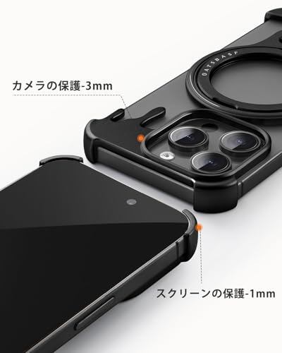 【マグネットに対応、360°回転スタンド】iPhone16Promax用のフレームレスケースは38個のN52強力マグネットを装着し、完璧なフィット感を実現します!どんなに振っても外れないです!また、モバイルバッテリー、カーマウント、スタンド、リングなど、ほとんどのマグネット対応アクセサリーと完璧に互換性があります。360°回転スタンドが搭載して、万能のスタンドようになります。ワイヤレス充電には対応していません。