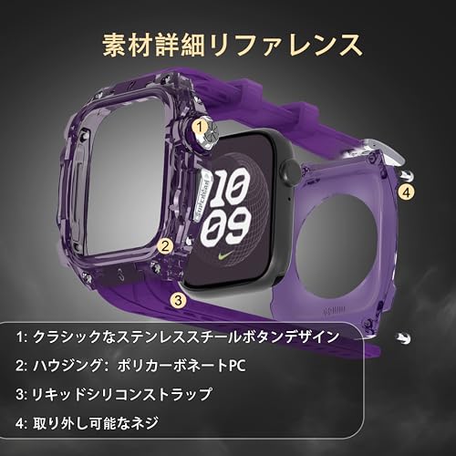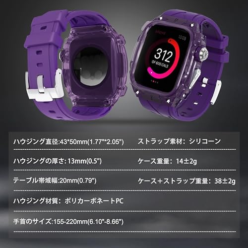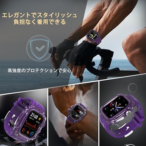 高級軽量透明ケース适用Apple Watch Series 10 46mmバンド カバー付き 高耐久 頑丈なケース シリコンストラップ 男性/女性用フル保護カバー(Purple)