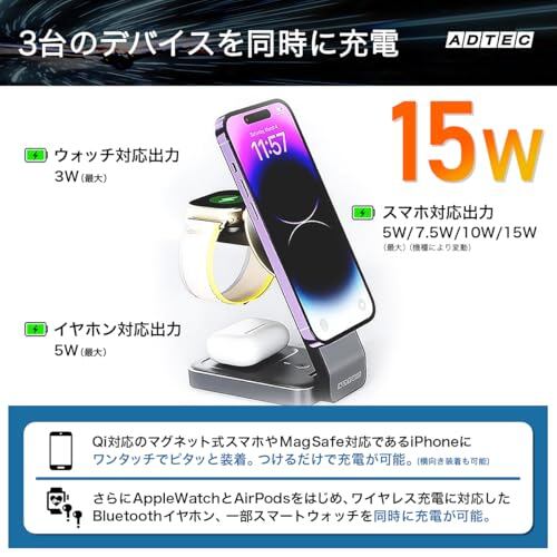 アドテック マグネット 3in1 ワイレス マグネット式充電器 高速15Wワイヤレス 33W 小型 PD充電器 Phone15/14/13/12 アップル製 Watch ワイヤレスイヤホン コンパクト AWPD-V015MEW-w33W-BM