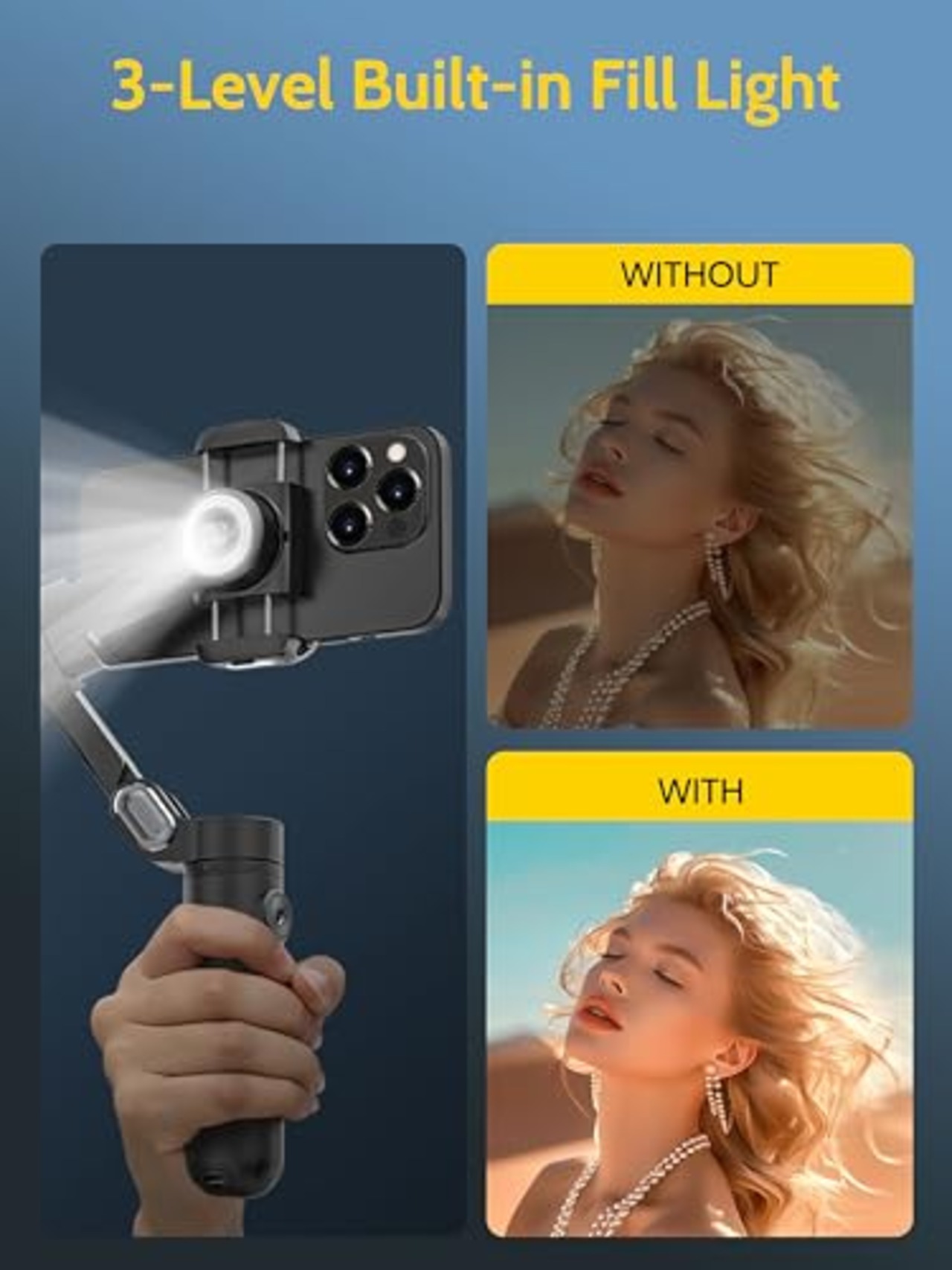 [1/4スレッド&内蔵LEDライト]ジンバルのサイド1/4スレッドにより、フィルライト、電話クリップ、マイクなどのアクセサリーを追加できます。 底部の1/4スレッドで、ジンバルをカメラの三脚にねじ込むことができ、シナリオの撮影ニーズを増やすことができます。内蔵のフィルライトの明るさを調整でき、ナイトショットも同様に素晴らしいものになります。