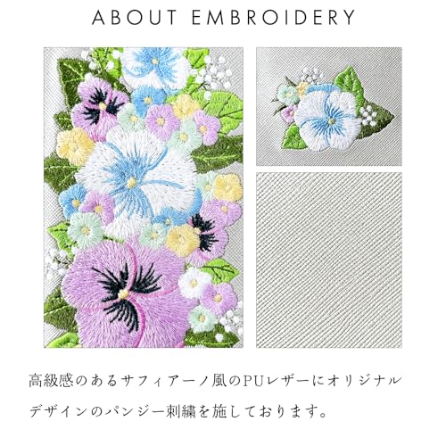 内側にはカードなどが収納できるポケット付きの、実用的なハンドあり手帳型ケースです。高級感のあるサフィアーノ調生地に華やかで上品なオリジナルデザインのパンジー刺繍を施しています。ストラップ穴付きのため、チェーンを付けたりストラップを付けることが可能となります。