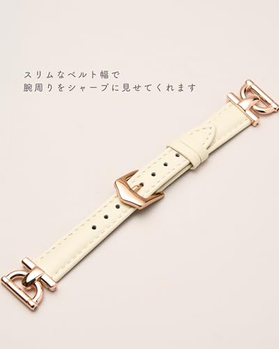 【高級感あふれる本革レザーを使用】本革レザーを使用し、手首回りに柔らかくフィットする装着感を実現。柔らかい素材で使えば使うほど手首に馴染み、長くお使いいただくことで本革本来の経年変化もお楽しみいただけます。デザイン性のある金具をデザインに追加し、コーデのアクセントになる本革バンドに仕上げました。女性の腕周りをよりシャープに演出してくれます。