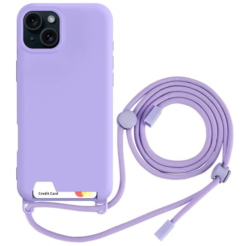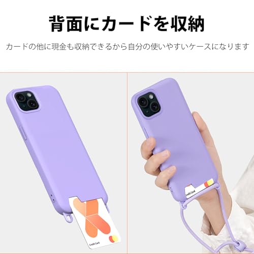 iPhone 15 用 ケース ショルダー シリコン iPhone 15 スマホケース アイフォン15カバー 耐衝撃 シリコン カード収納 軽量 肩掛け 斜めかけ 縄掛けケース 紐付き 斜めがけ 織りストラップ付き 長さ調整可能 取り外しワイヤレス充電対応(パープル)