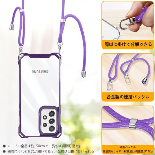 Galaxy A52 5G ケース クリア PC ショルダー 軽量 耐衝撃 カバー ギャラクシーA52 5G SC-53B SCG05 ケース 透明 薄型 軽量 PC背面 + TPUバンパー 二層構造 携帯ケース 首掛け 肩掛け 斜めかけ 縄掛けケース ストラップ付き 1.5M 取り外し可能 縦/横 2WAY 調節可能な 全面保護 落下防止 衝撃吸収 ワイヤレス充電対応 (パープル)