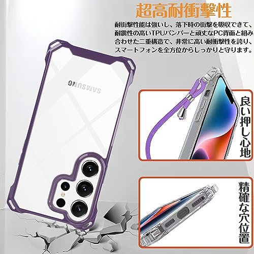 Galaxy S24 Ultra ケース クリア PC ショルダー 軽量 耐衝撃 カバー ギャラクシーS24Ultra SC-52E | SCG26 ケース 透明 薄型 軽量 PC背面 + TPUバンパー 二層構造 携帯ケース 首掛け 肩掛け 斜めかけ 縄掛けケース ストラップ付き 1.5M 取り外し可能 縦/横 2WAY 調節可能な 全面保護 落下防止 衝撃吸収 ワイヤレス充電対応 (パープル)