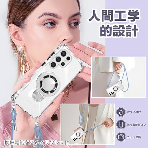 weiaoluo Galaxy s24 Ultra/s25 Ultra ケース クリア リング付き MagSafe対応 ショルダー ギャラクシー S24 Ultra カバー TPU 耐衝撃 透明 イヤレス充電 マグネット搭載 調節可能 保護ソフト 取り外し 薄型 肩がけ 首掛け 紐付きバンパー ストラップ付き ホール付き 着脱可 Qi充電(縄掛け-アッシュブルー)
