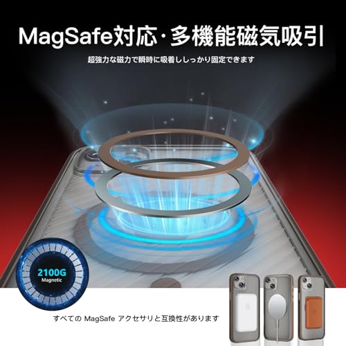 【MagSafe対応/ワイヤレス充電】本製品はMagSafe対応で、強力な磁力で高速かつ効率的なワイヤレス充電が可能です。汎用性が高く、車載マウントやホルダーに取り付けることができ、運転中にスマートフォンを快適に使用できます。また、さまざまなMagSafeアクセサリと組み合わせることができ、内蔵の磁気リングでデバイスをしっかりと固定し、安全でスムーズな充電を実現します。また、Qi規格にも対応しており、幅広いワイヤレス充電器と互換性があります。
