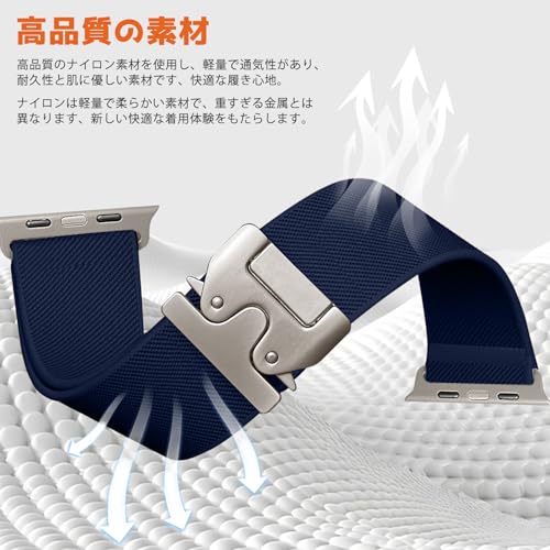 [アップグレードされたパラシュートバックル] この Apple Watch 用ストレッチナイロン時計バンドには、安定したパラシュートバックルが付いています。軽量で美しく、安定した着け心地を実現します。バックルの長さは簡単に調整可能で、手首にぴったりフィットし、締め付け感なく快適です。見た目も素晴らしく、安定していて快適に着用できます。バックルは操作が簡単で、軽く押すだけで簡単に固定または取り外しでき、自由に調整でき。[使用するストラップのサイズの範囲: ストラップの最長寸法は 180 mm (7.09 インチ)、最短寸法は 110 mm (4.33 インチ) です]