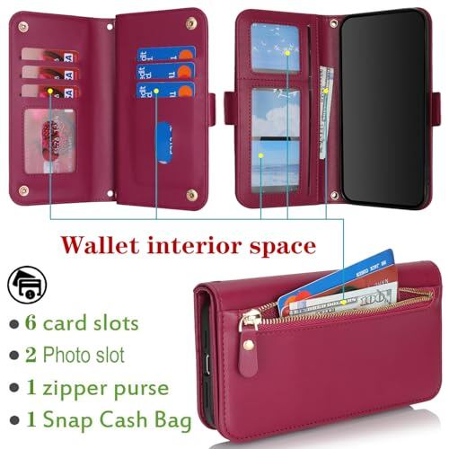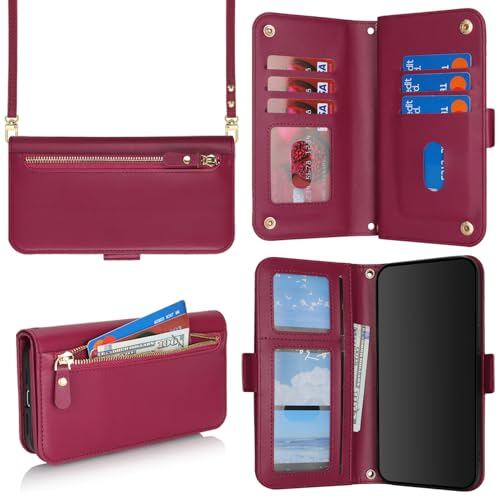 for iPhone 13 ケース アイホン 14 肩がけ 首掛け 斜め掛け ファスナー ストラップ付き ショルダーケース 手帳型 CASE カバー SunYoo カード収納 横置き スタント PUレザー 財布型 for iPhone14 iPhone13 レッド