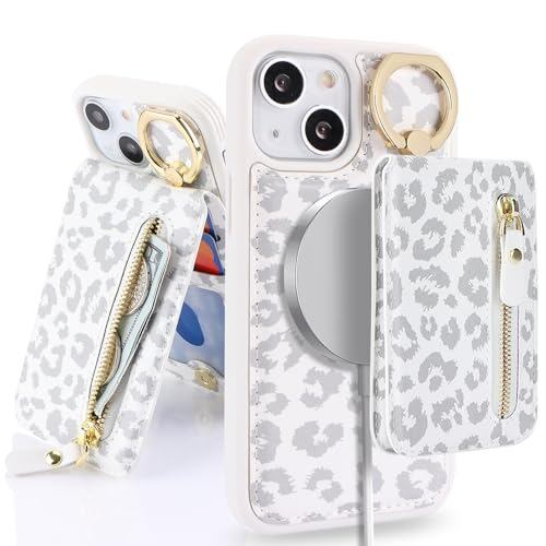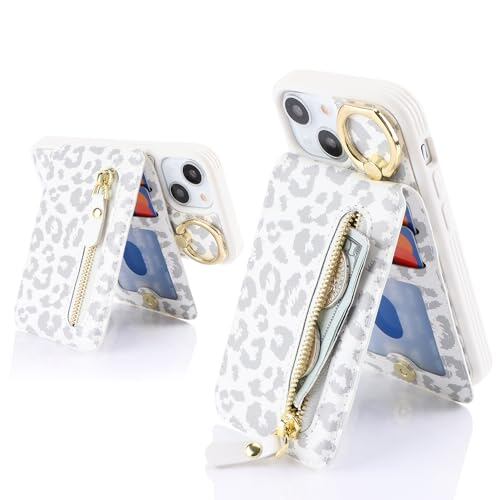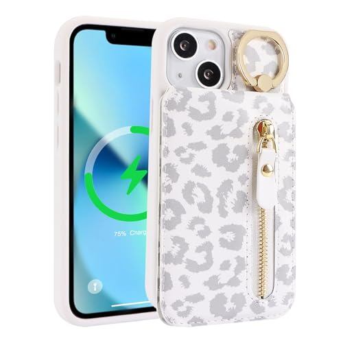 iPhone 13 mini ケース 分離可 カードケース リング付きケース magsafe対応ケース マグセーフ アイホン13ミニ リング付き iPhone 13mini カバー スマホケース アイフォン13 ミニ アイホン 13 mini case 適用 iCoverCase リング カード収納 スナップ 横置き スタンド マグネット ファスナー 携帯カバー 豹柄 ヒョウ柄 ホワイト