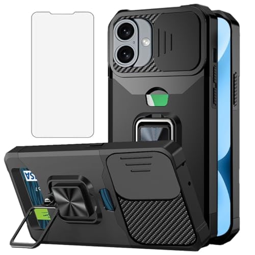 NKECXKJ iPhone 16 用ケース + 强化 ガラス フ フィルム 財布型カード収納 スマホケース 横置き機能リング スタンド 耐衝撃 Case Cover いphone16 アイフォン16 アイホン16 iPhone16 対応 背面 カバー 6.1インチ(ブラック)