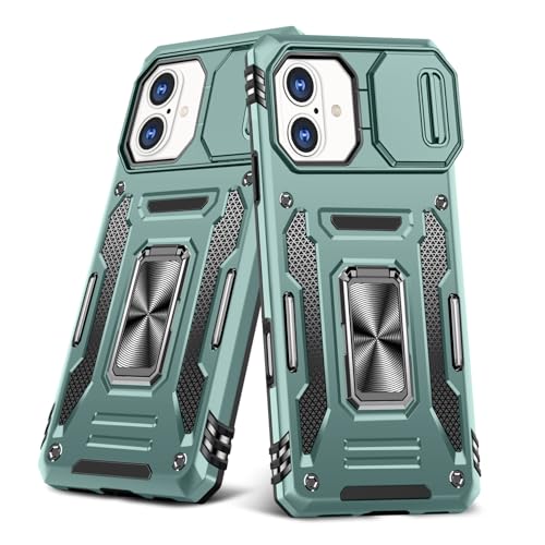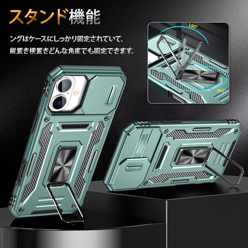 YULNCUZ iPhone 17 対応 金属リングスタンド付き スライド式カメラカバー ケース 磁気車載対応 耐衝撃 MIL規格認証 レンズ保護 スタンド機能 衝撃吸収 縦横両用 滑り止め 指紋防止 防塵 6.3インチ グリーン K329