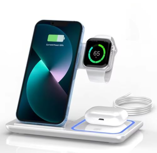 ワイヤレス充電器 3in1 急速充電(15W/10W/7.5W/5W) iPhone16/16Plus/16Pro /16Pro Max /15/14/13/12Pro/ProMax/Galaxy/GooglePixel/スマホ各種/AirPods/Apple Watch、ワイヤレス充電機能付きデバイス各種など対応(Cタイプ充電ケーブルー付属)ホワイト