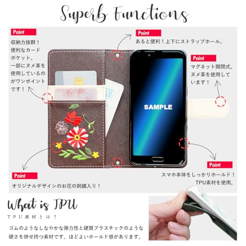 arrows NX9 F-52A 手帳型 ケース カバー F52A F-52Aケース F-52Aカバー F52Aケース F52Aカバー arrowsNX9 手帳ケース 手帳型ケース スマホケース ちょいヌメ花刺繍 ブラウン