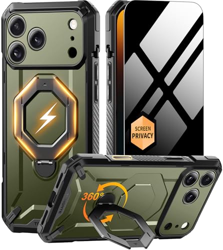 TONGATE iPhone 17 Pro Maxケース用360°回転マグネットスタンド、[MagSafe対応] [軍用規格落下保護] プライバシースクリーンプロテクター&カメラコントロール付きiPhone 17 ProMax用カバー、グリーン