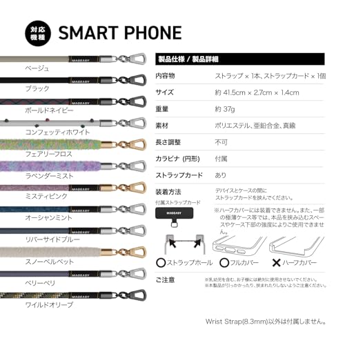 【製品仕様】… ◆ 対応機種 : SMART PHONE スマートフォン 各種 ◆ 内容物 : ストラップ × 1本、ストラップカード × 1個 ◆ サイズ : 約 41.5cm × 2.7cm × 1.4cm ◆ 重量 : 約 37g ◆ 素材 : ポリエステル、亜鉛合金、真鍮