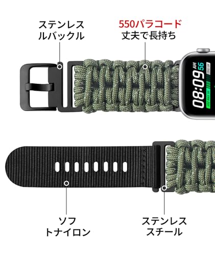 コンパチブルApple Watch バンド パラコード ナイロン 49mm 46mm 45mm 44mm 42mm 手作り編み込み 軍事風パラコード 坚固で耐久性の互换アップルウォッチベルト冒険スポーツ 互换iWatch 10/9/8/7/6/5/4/3/2/1/SE Ultra 2/1 (グリーンリフレクション)