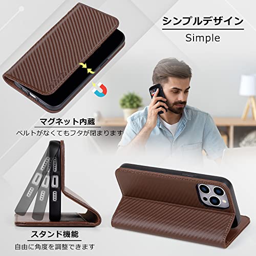 VISOUL iphone14 ProMax ケース 手帳型 本革 レザー マグネット式 スタンド機能付き手帳型ケース カードポケット 携帯ケース 全面保護 マグネット内蔵 柔軟なTPU素材 スマホケース iphone 14 ProMax 対応 6.7インチ アイフォン14 ProMax カーボンレザー.ブラウン
