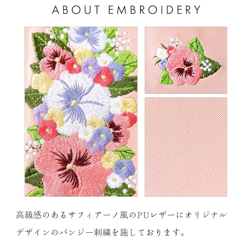 内側にはカードなどが収納できるポケット付きの、実用的なハンドあり手帳型ケースです。高級感のあるサフィアーノ調生地に華やかで上品なオリジナルデザインのパンジー刺繍を施しています。ストラップ穴付きのため、チェーンを付けたりストラップを付けることが可能となります。
