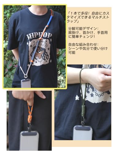 【分体や自由に組み合わせ可能】スマホストラップは分解して再構成することができ、付属品の中の2つのリング型カラビナを利用して異なる長さのハンドストラップ、フィンガーストラップ、ネックストラップを再構成することができます。結び方によってストラップの長さを短くすることができ、自分の必要に応じて結び目の数を決めることができす。結んだ紐も美しく、かえって特別です。いわば一縄多用で、非常に便利で、もっと多くの使い方が開発されます。