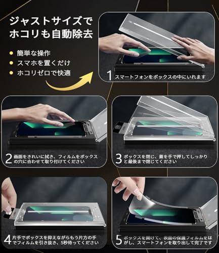 【最新なフィルム貼り付けデザイン・秒で貼り付け】 いPhone13 Pro Max ガラスフィルム を貼るときに、位置ずれ・ホコリの混入・気泡などで悩んだことはありませんか?こうした悩みを解決するために、画期的な自動位置決めBOXを開発しました!革新的な自動位置合わせ&自動吸着技術を採用し、引くだけでホコリや気泡を瞬時に排出。いPhone13Promaxをボックスに入れ、いPhone13 Pro max フィルム をフレームに入れてガイドシートを引くだけで、ズレることなくスピーディーに貼り付け可能。未経験の方でも、簡単・完璧に貼ることができます。