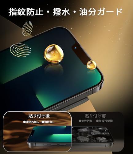 【指紋防止・撥油疎水】特殊加工のアイフォン13Promax ガラスフィルム は、指紋が目立ちにくく、油分や水分、付着した水滴や汗、化粧品等簡単に拭き取ることが可能です。スマホの画面を新品のようにきれいに保つことができます。