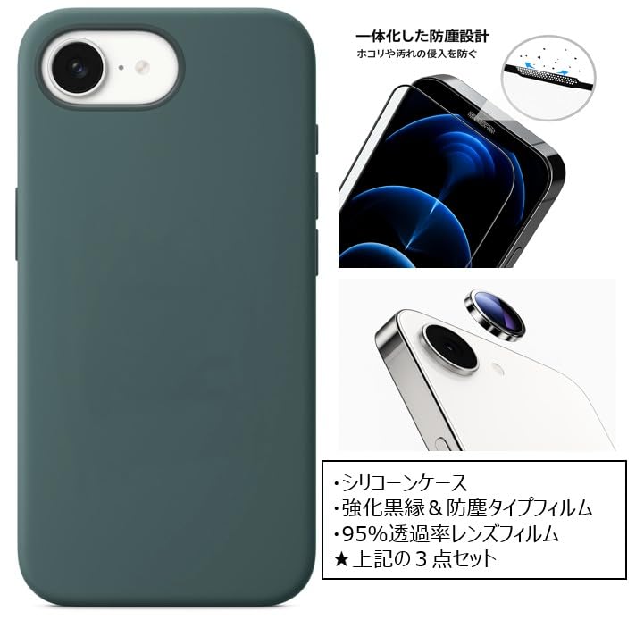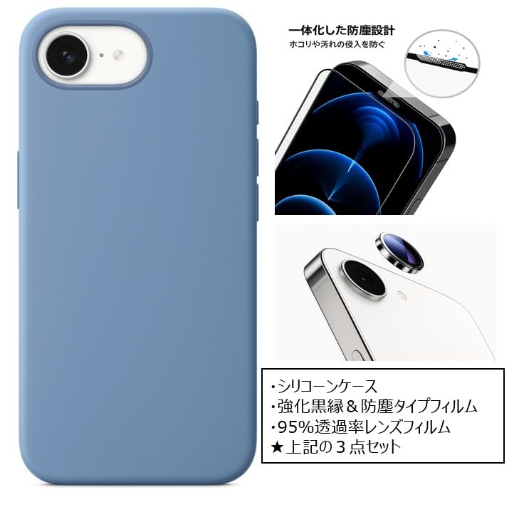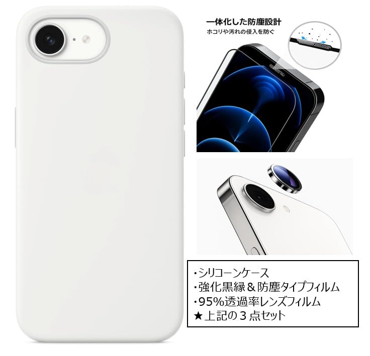 ①シリコーンケース、②一体式防塵フィルム、③カメラ保護フィルムの三点セットになります。Apple社外品になりますので、ご確認&ご了承の上、ご購入ください。