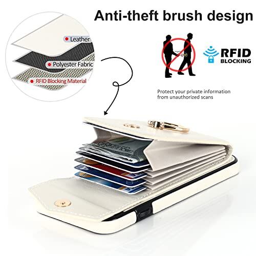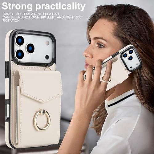 GOKIGIOD 適用 iPhone 17 pro max ケース リング付き 背面 財布型 カード入れ いphone17promax リング カバー ストラップ アイフォン 17 プロ マックス スマホケース 背面ポケット カード収納 可愛い お洒落 RFIDスキミング防止機能 カードポケット ハンドストラップ 縄掛け 携帯カバー ベージュ ホワイト Beige white