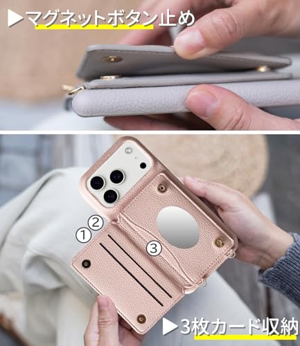 【カード収納・鏡付き】キャッシュレス化が進む現在、お出かけ時にカード収納・鏡付きができ身軽になれる 17 ケースが大人気!本製品は背面カード入れ ケースが付き、ICカード、お札などを収納できる手帳型 ショルダー ケースです。●マグネットボタン付きで開け閉めがとても便利!カードポケットをしっかり止められ、カードが落ちる心配がありません。●ミラーも付き、メイク直し時や身だしなみのチェックに最適です。