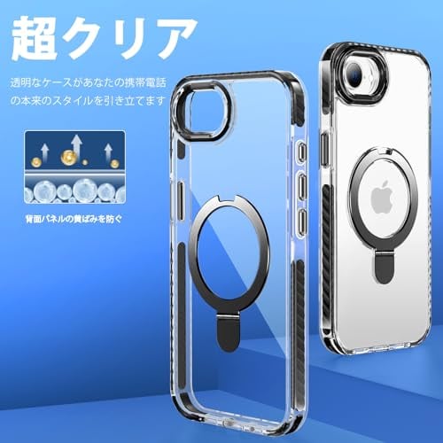 Sterker iPhone 16e ケース 6.1インチ用 [マグネット式リングスタンド付き] [Magsafe対応] [ミリタリーグレードの落下保護] スリム 耐衝撃 黄ばみ防止 保護クリアケース, 黒