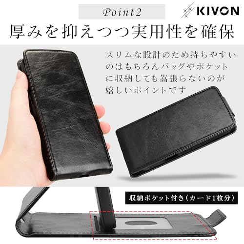 【縦開き&自立式】スタンド機能を備えた縦開き構造で、ビデオ通話やリモート会議中もスマートに使えます。机の上に自立するため、両手が空いて作業効率もアップ。 【ビジネスに映える高級感】上質なPUレザーを使用し、落ち着いたカラーバリエーションでビジネスシーンにも最適。カバンやスーツとの相性も◎ 【カードポケット付き】内側にはカードを1枚収納できるスリムなポケットを搭載。ICカードや名刺など、必要最低限の携帯に便利です。 【薄型&精密設計】本体にしっかりフィットする専用設計で、カメラやボタン周りも快適に操作可能。ケースを装着したまま充電もOK。 【KIVONブランド品質】機能性とデザイン性を両立したスマホケース。 ※環境に配慮した簡易包装のため、パッケージに若干のシワが見られる場合がございます。品質には影響ございませんのでご安心ください。