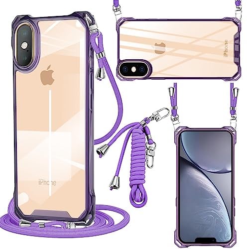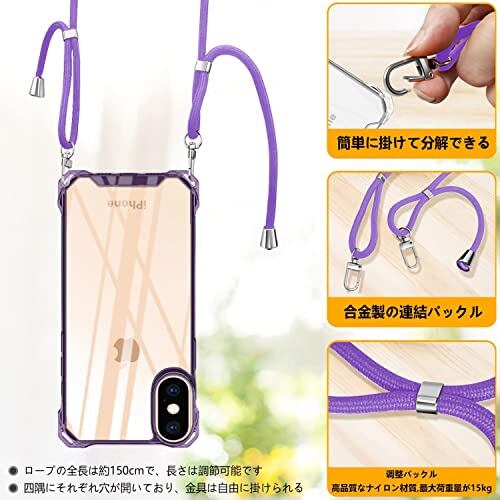 iPhone X//XS ケース クリア PC ショルダー 軽量 耐衝撃 カバー アイフォンX/XS ケース 透明 薄型 軽量 PC背面 + TPUバンパー 二層構造 携帯ケース 首掛け 肩掛け 斜めかけ 縄掛けケース ストラップ付き 1.5M 取り外し可能 縦/横 2WAY 調節可能な 全面保護 落下防止 衝撃吸収 ワイヤレス充電対応 (パープル)
