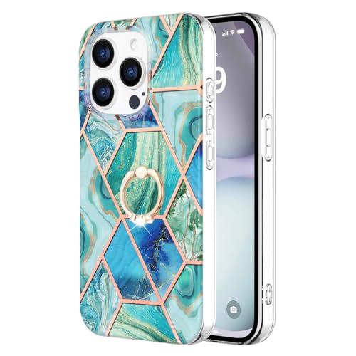 YUYIB スマホケース 対応 iPhone 15 Pro ケース リング付き 大理石柄 メッキ加工 キラキラ かわいい キャラクター ディズニー 美しい おしゃれ 女性 人気保護カバー 薄型 軽量 アイフォン15プロ 携帯電話かばー (グリーン, iPhone15 Pro)