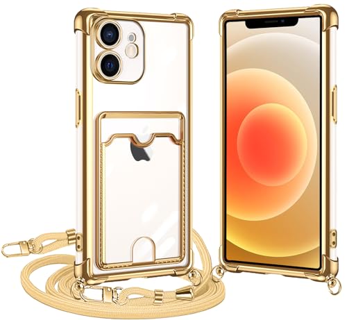 iPhone 12 ケース クリア ショルダー iphone12 カバー カード収納 アイフォン12 スマホケース 肩掛け 首かけ 斜めがけ 縄掛け ケース 透明 TPU 耐衝撃 薄型 軽量 カード入れ 財布型 スマホケース 調節可能な 落下防止 紛失防止 (ゴールド)