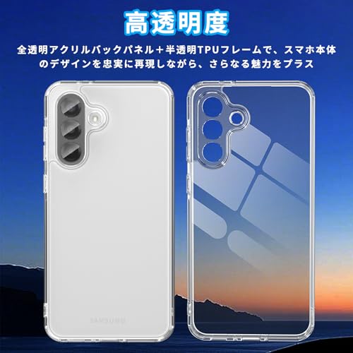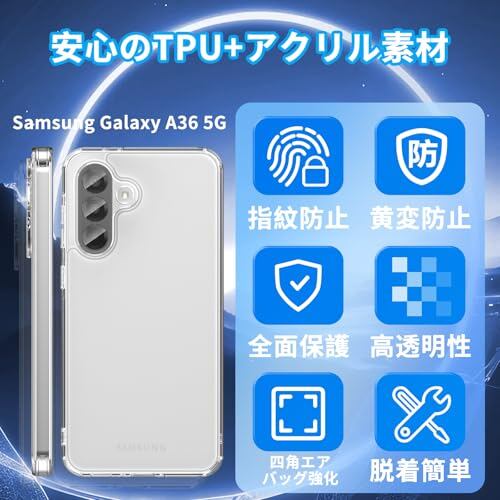 [5D全透明バックプレート]TPU透明ケースは99%の透過率を実現し、Samsung Galaxy A36の美しいボディデザインを忠実に再現。航空機級の黄変防止素材を採用し、特殊コーティング処理を施しているため、紫外線・汗・経年劣化による変色や黄ばみを防止。長期間使用しても透明で美しい状態を保ちます。