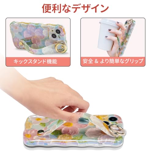 QLTYPRI iPhone 13 用 ケース TPUカバー ウェーブ おしゃれ 韓国 可愛い 花柄 薄型 軽量 耐衝撃 スマホケース ハンドベルト付き カラビナリング付き スタンド機能 ワイヤレス充電対応 ストラップホール付き アイフォン13 ケース 6.1インチ 対応 - グリーン
