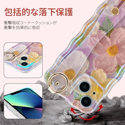 QLTYPRI iPhone 14 用 ケース TPUカバー ウェーブ おしゃれ 韓国 可愛い 花柄 薄型 軽量 耐衝撃 スマホケース ハンドベルト付き カラビナリング付き スタンド機能 ワイヤレス充電対応 ストラップホール付き アイフォン14 ケース 6.1インチ 対応 - ピンク