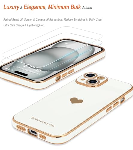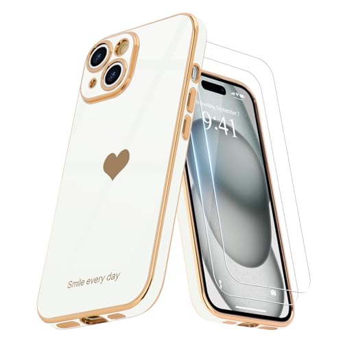 Teageo iPhone 15 Plus 用 ケース 【1枚ケース+2枚ガラスフィルム】 全面保護 女の子 可愛い おしゃれ ハート スマホケース 薄型 耐衝撃 落下防止 メッキ加工 アイフォン 15 Plus 適用 保護カバー(ホワイト)