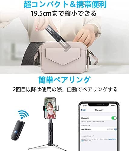 【コンパクト収納、携帯便利、良い素材】ミニサイズ、超軽量の自撮り棒が登場して、折りたたみ19.5㎝、重さはわずわずか164g,女性やお年寄りや子供も気軽に持ち運べ、安心して撮影できます。シンプルなデザインなので、男性でも気兼ねなく持てる、アウトドアや旅行の撮影には最適です。ABS+ステンレスチールは錆びにくく、スムーズに伸縮できます。耐摩耗性抜群です。