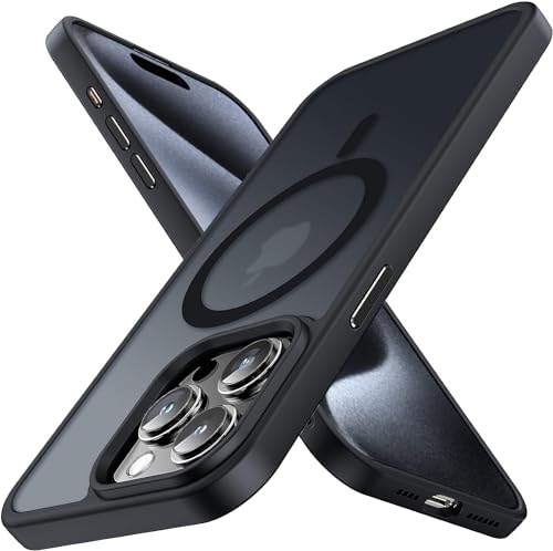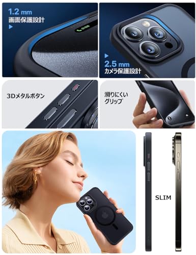 iphone15pro max ケース Magsafe対応 半透明 マット背面 ハイクラス マグセーフ ケース マグネット搭載 TPU 滑り止め ワイヤレス充電 対応 米軍MIL規格取得 耐衝撃 すり傷防止 指紋防止 ストラップホール付き アイフォン 15pro maxカバー ブラック(Black, iPhone15promax)