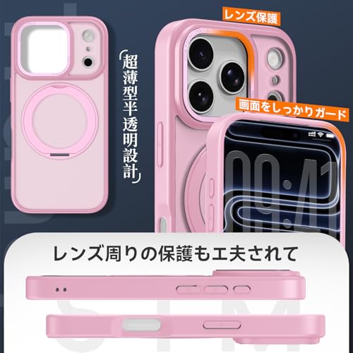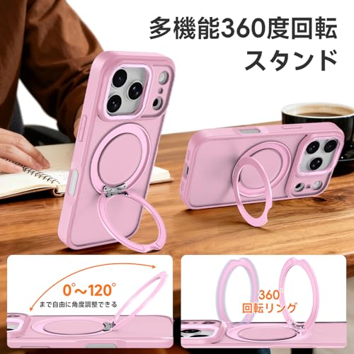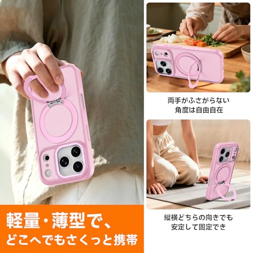 iPhone 17 Pro Max 用 ケース Magsafe対応 ワイヤレス充電 360°回転スタンド 縦横多角度調整可 スマホケース アイフォン 17 プロ マックス 用 半透明 指紋防止 米軍規格 耐衝撃 マグセーフ対応 リング マグネット搭載 アイホン17 プロマックス 向けの カバー (ピンク)