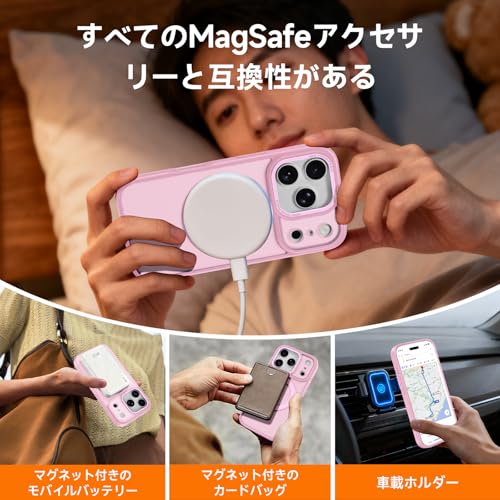 【MagSafe対応・磁力パワーアップ】:強力なN52マグネットを内蔵し、10倍の吸引力を実現。ケースを付けたままでも高速ワイヤレス充電が可能で、放熱性にも優れています。MagSafe充電がこれまで以上に簡単かつスムーズに!強力な磁力により、運転中の激しい振動でもMagSafe対応の車載ホルダーから外れず、市販のさまざまなMagSafeアクセサリーと互換性があり、ワイヤレス充電やモバイルバッテリー、車載ホルダー、スタンド、リングなどもスムーズに使用できます。