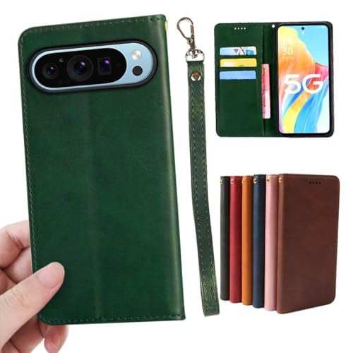 GOKIGIOD 適用 Google Pixel 9 Pro XL ケース 手帳型 PUレザー ストラップ 同梱 カード収納 スタンド機能 耐衝撃 グーグル ピクセル9 プロ XL スマホケース 手帳 Pixel9proXL case カバー 財布型 内蔵マグネット 弱磁 ストラップホール 携帯カバー レトロ グリーン