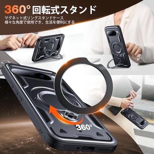 WYUIC 対応 Google Pixel 9/9 Pro 用 [Magsafe 対応] 定点360° 回転 落下衝撃吸収、フルプロテクト、内蔵インビジブルスタンド付き 保護ケース ブラック