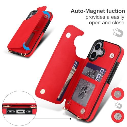 GOKIGIOD 適用 iphone 17 ケース ショルダー 窓口式 カード入れ スマホケース ストラップ付き アイフォン17 カバー 手帳型 斜めがけ 可愛い iphone17 ショルダーケース 首かけ 肩掛け かわいい おしゃれ RFIDスキミング防止機能 ロング クロスボディ 携帯カバー レッド
