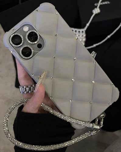 アイフォン用ケース チャーム付き シルバーストーン キルティングケース 凸凹 大人 きらきら 可愛い スマホケース カバー シリコン素材 ソフト レディース 女性 かわいい カワイイ シルバー キラキラ マット ストラップ スマホストラップ お洒落 チャーム (グレー, アイフォン16Pro用)